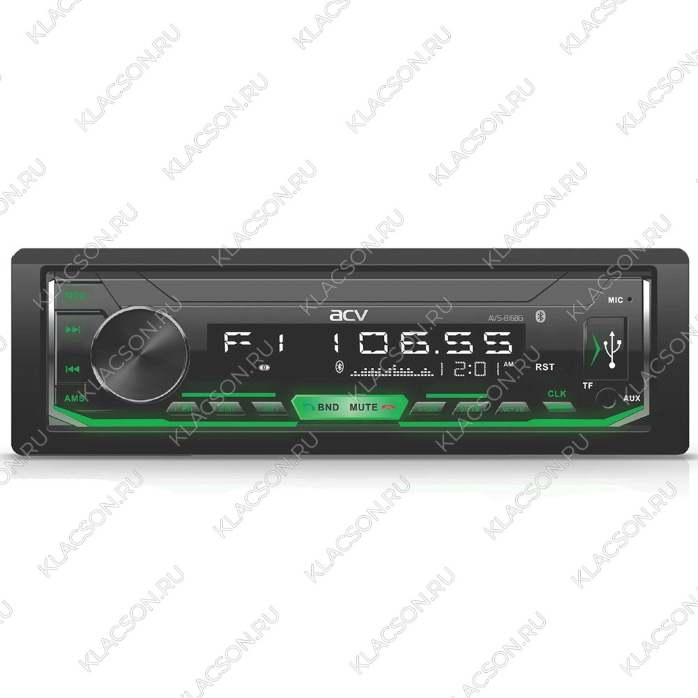 Магнитола 1 DIN с зеленой подсветкой и современным Bluetooth модулем, поддержкой приложений ACV RC для Android и ACV Control для iOS. Обладает всеми необходимыми функциями для воспроизведения музыки в автомобиле с разных источников. Читает MP3/WMA файлы и оснащена RCA стерео выходами.