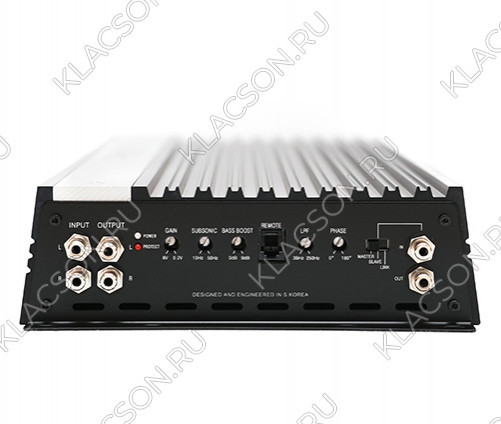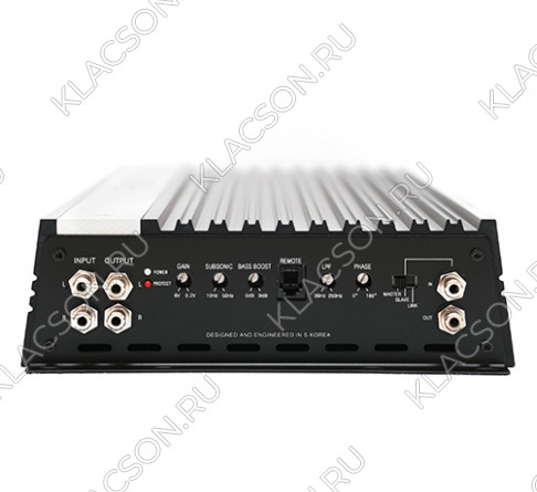 Лучший вариант схематехники, разработанный на базе производства в Южной Корее Стабильно работает на нагрузку 1 Ом. Мощность 3000 Вт на нагрузку 1 Ом, при напряжении 14.8 вольта и К.Н.И. на уровне ~5%, что является нормой для сабвуферного звена. Дистанционный регулятор уровня входной чувствительности имеет светодиодный индикатор превышения порога допустимых искажений. Возможна работа в режиме «мостового включения»