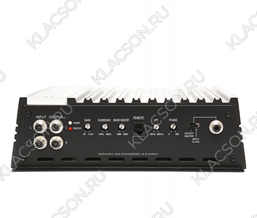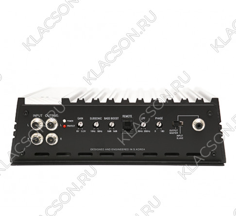 Лучший вариант схематехники, разработанный на базе производства в Южной Корее. Стабильно работает на нагрузку 1 Ом. Мощность 1000Вт на нагрузку 1 Ом, при напряжении 14.8 вольта и К.Н.И. на уровне ~5%, что является нормой для сабвуферного звена. Дистанционный регулятор уровня входной чувствительности имеет светодиодный индикатор превышения порога допустимых искажений. Возможна работа в режиме «мостового включения»